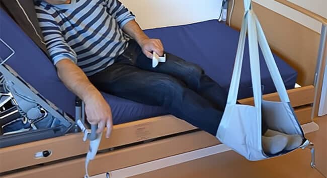 Hjælpemidler som Benløfteren er et værktøj, der hjælper brugeren til at få fødderne op fra gulvet og hele vejen til midten af lejet/sengen.