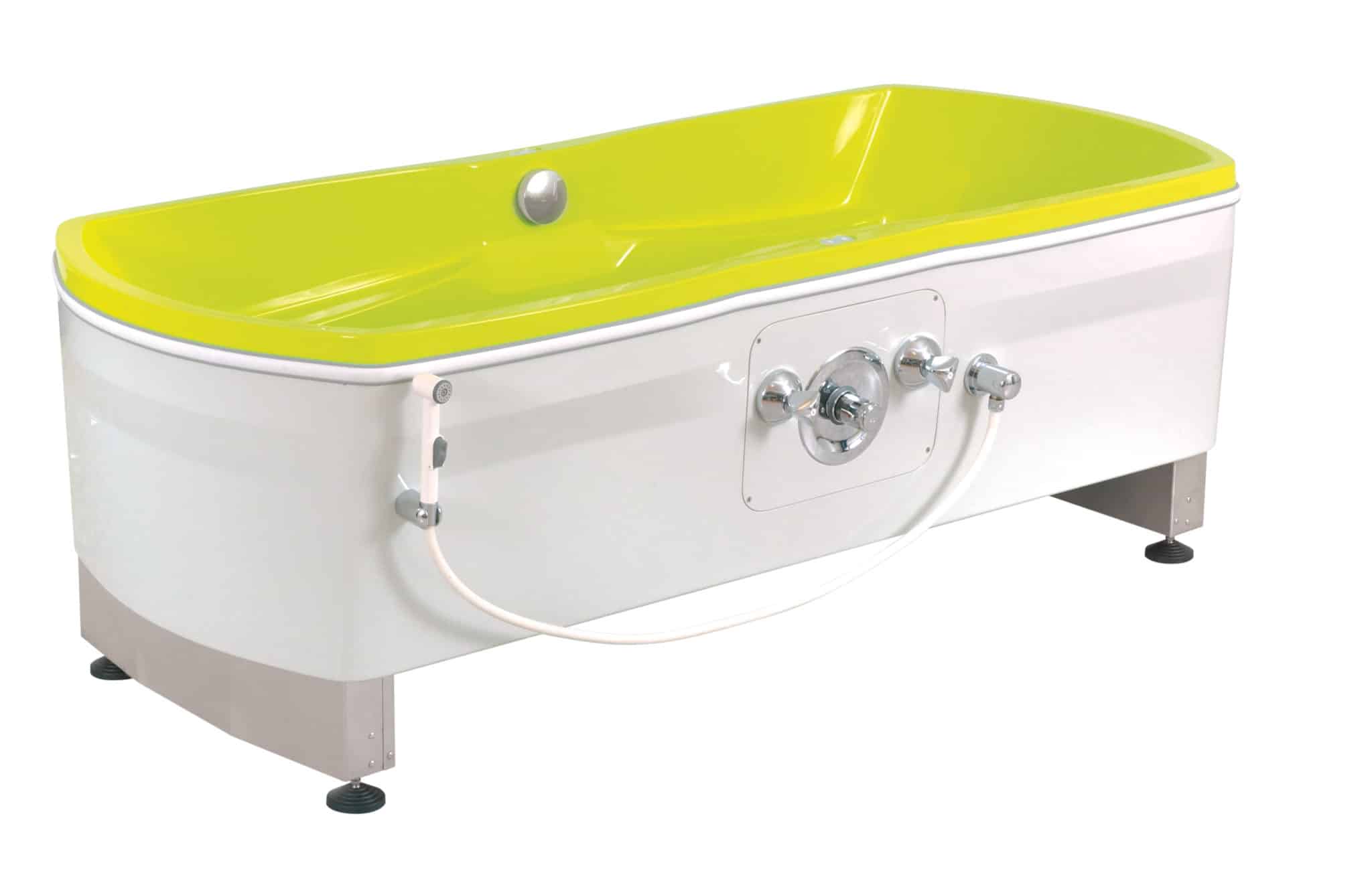 Ergonomisk designet badekar der sikrer større bevægelighed for brugeren og plejer. Højdejusterbar badekar i glasfiber med beskyttelse gummi monteret på indvendig sider. Manual ventiler på begge sider af termoventil.