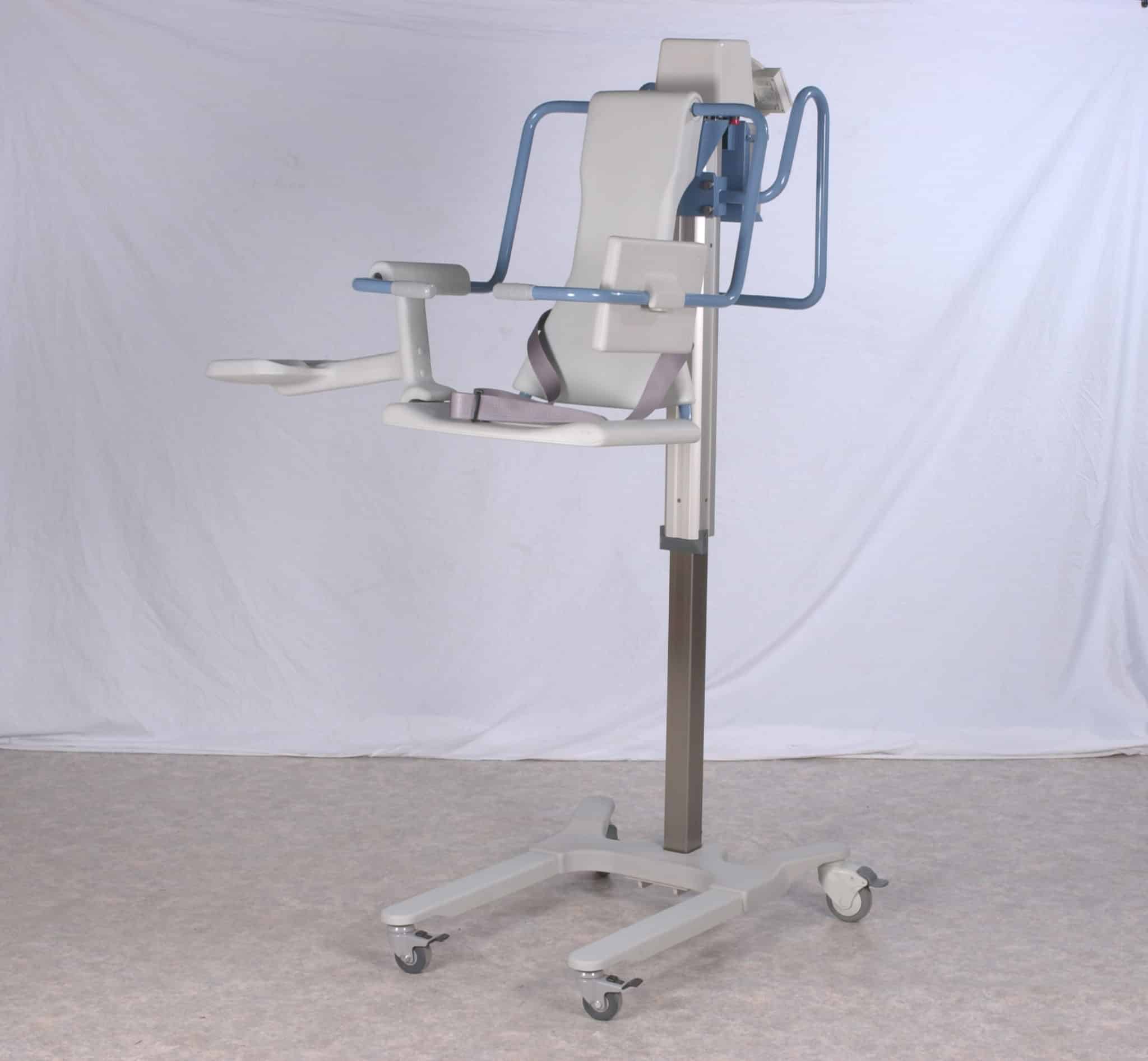 Moveable electric lifting equipment for easier care of patients in a seated position. The patient lifter may be raised or lowered by using a hand control. Metal construction of stainless steel and galvanized steel and powder coated steel.