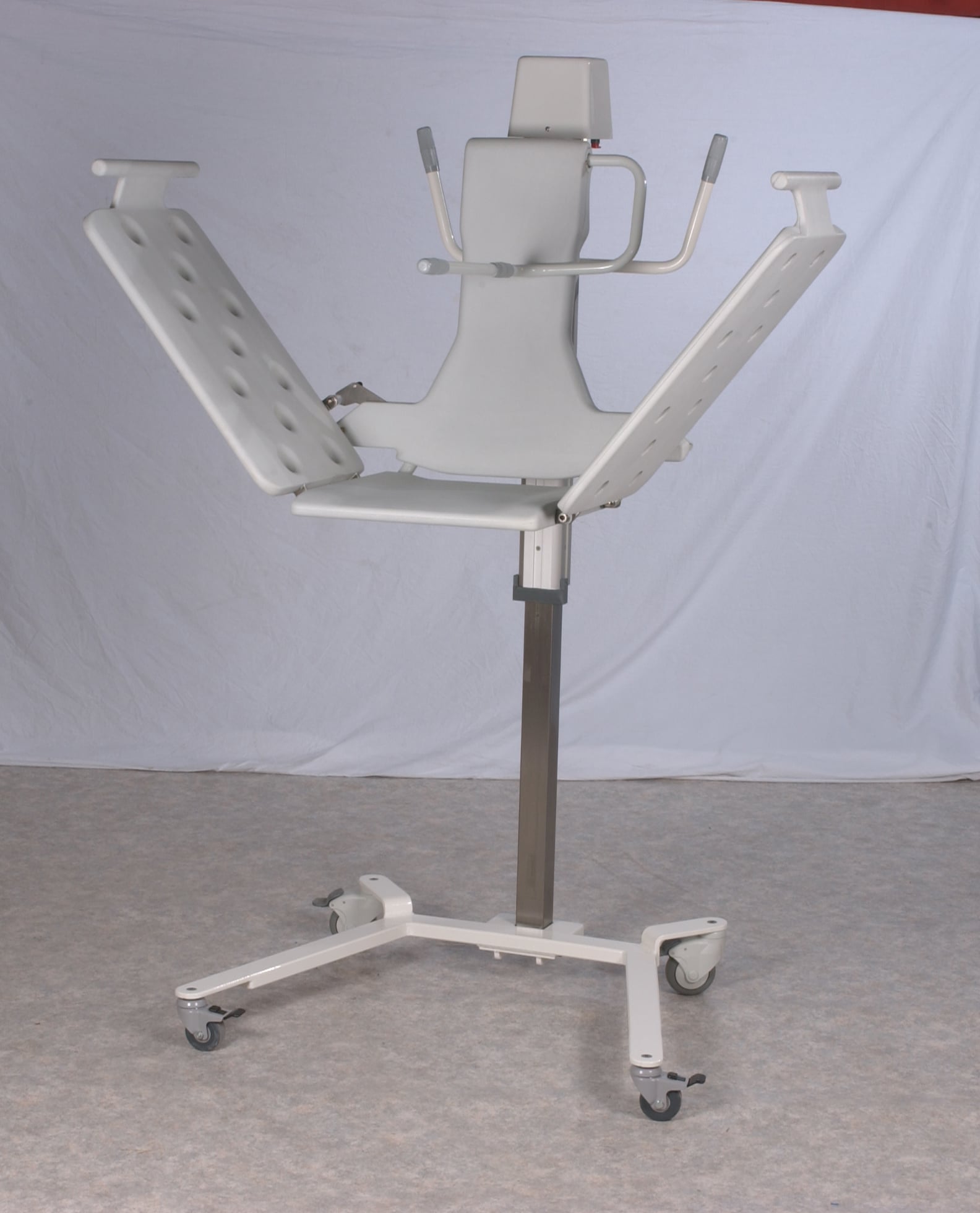 Moveable electric lifting equipment for easier care of patients. The patient lifter may be raised or lowered by using a hand control. Metal construction of stainless steel and galvanized steel and powder coated steel.