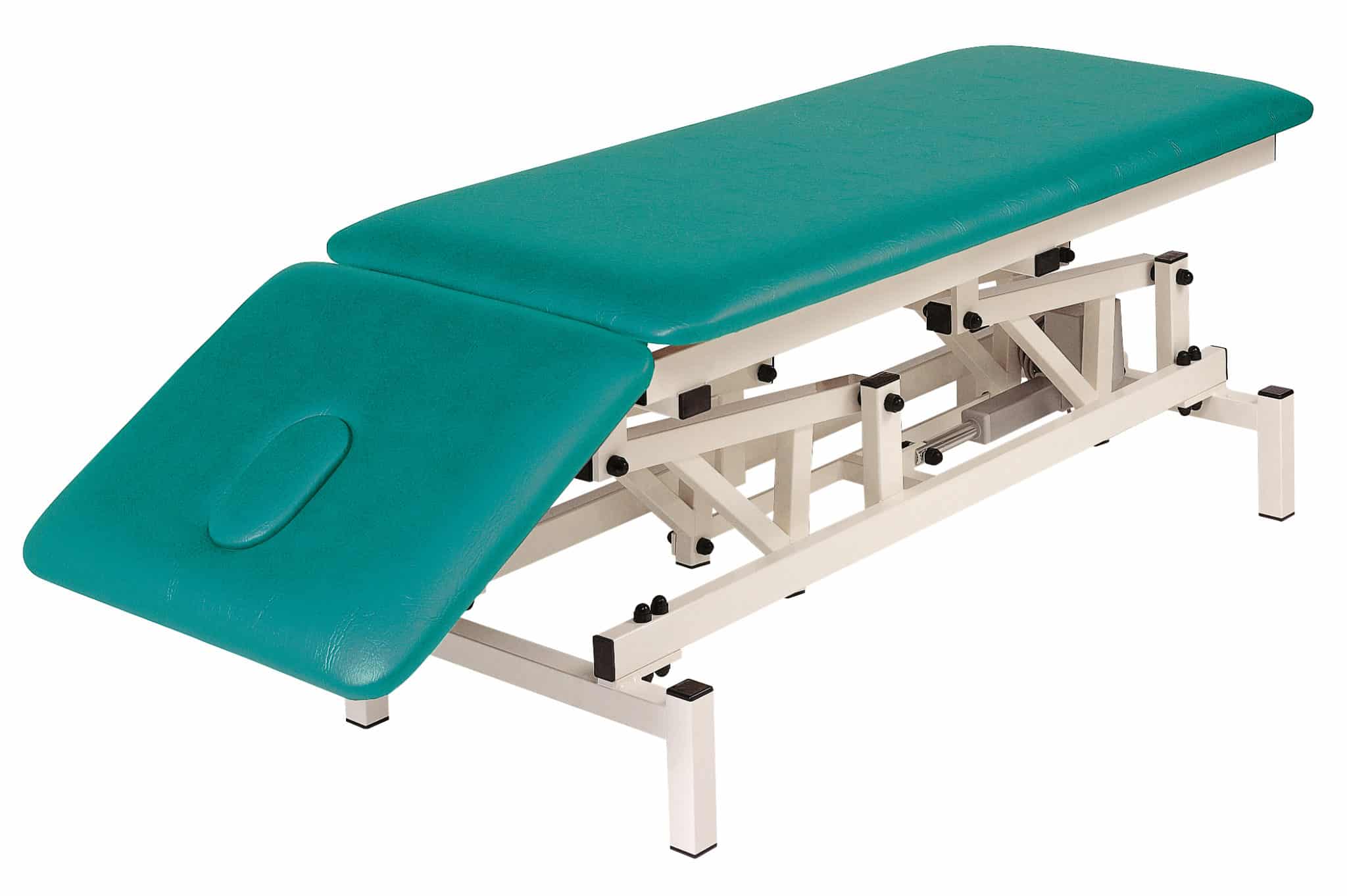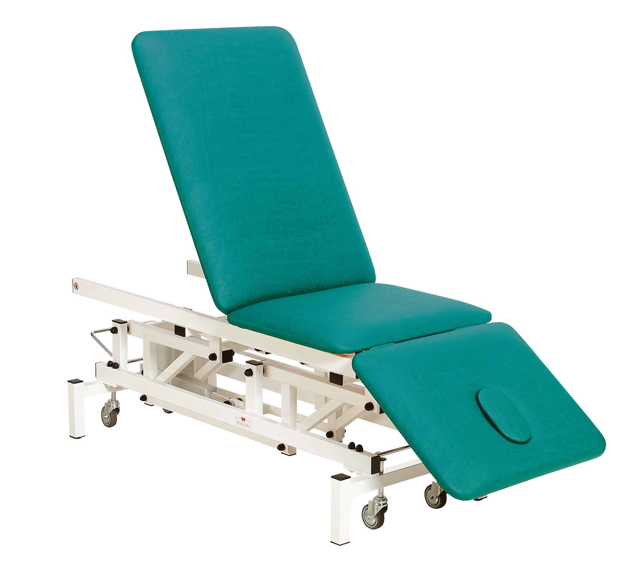 This couch is available in a hydraulic or electric e adjustable version. The electric version can be supplied with a hand- or footswitch. The hydraulic version has a foot pedal on each side. The couch is available with or without castors. When supplied with castors, a central locking system will cause the wheels to brake simultaneously.